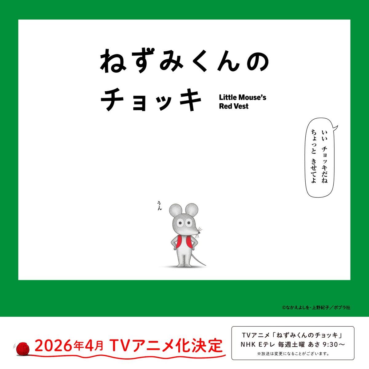 『ねずみくんのチョッキ』のアニメは、NHKのEテレで、2026年4月4日から毎週土曜朝9:30~に放映されています!